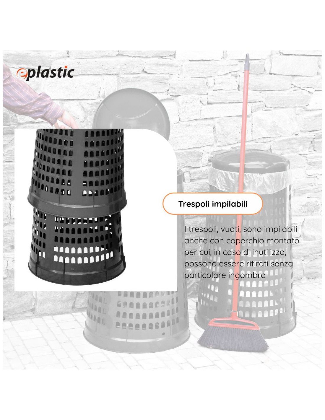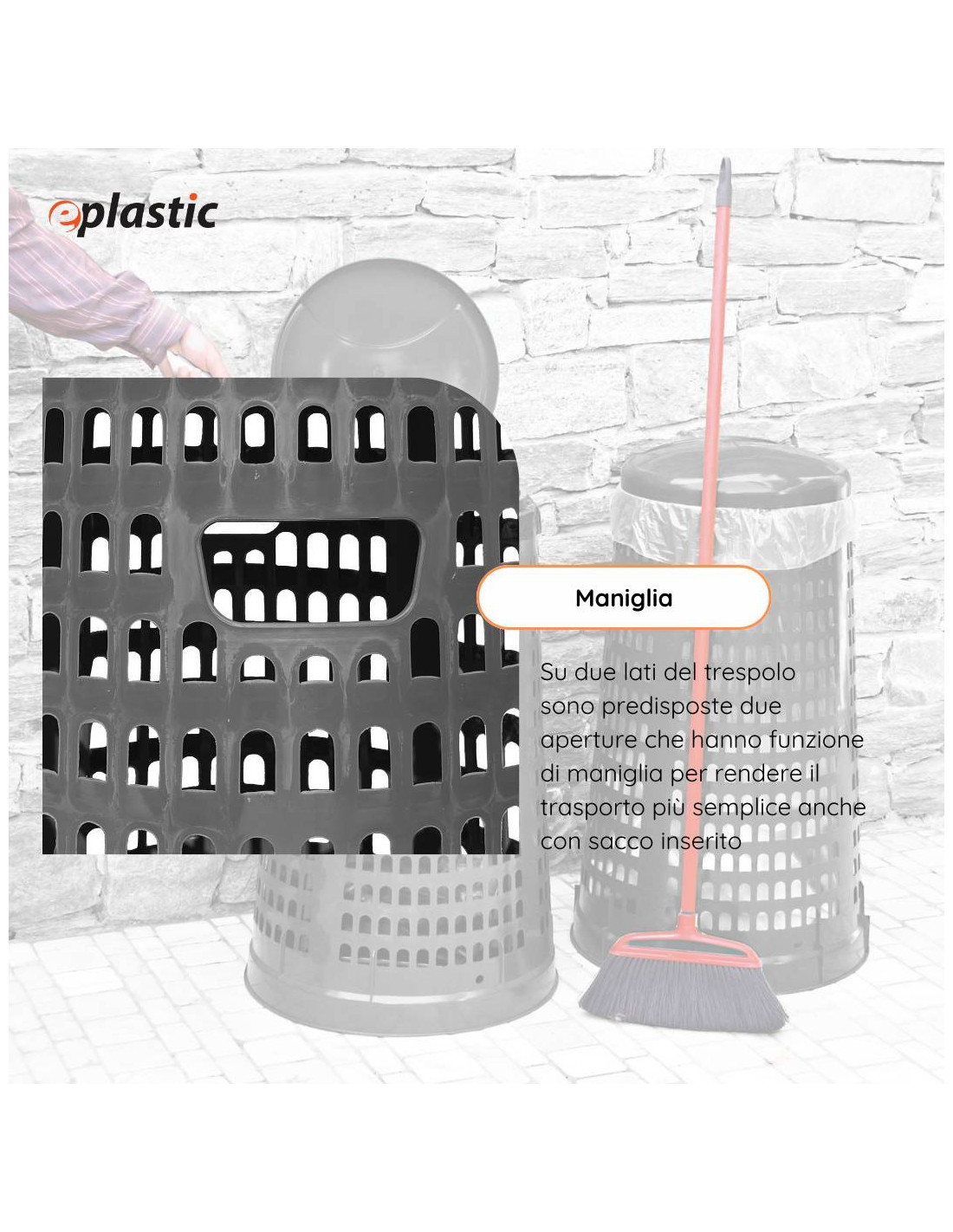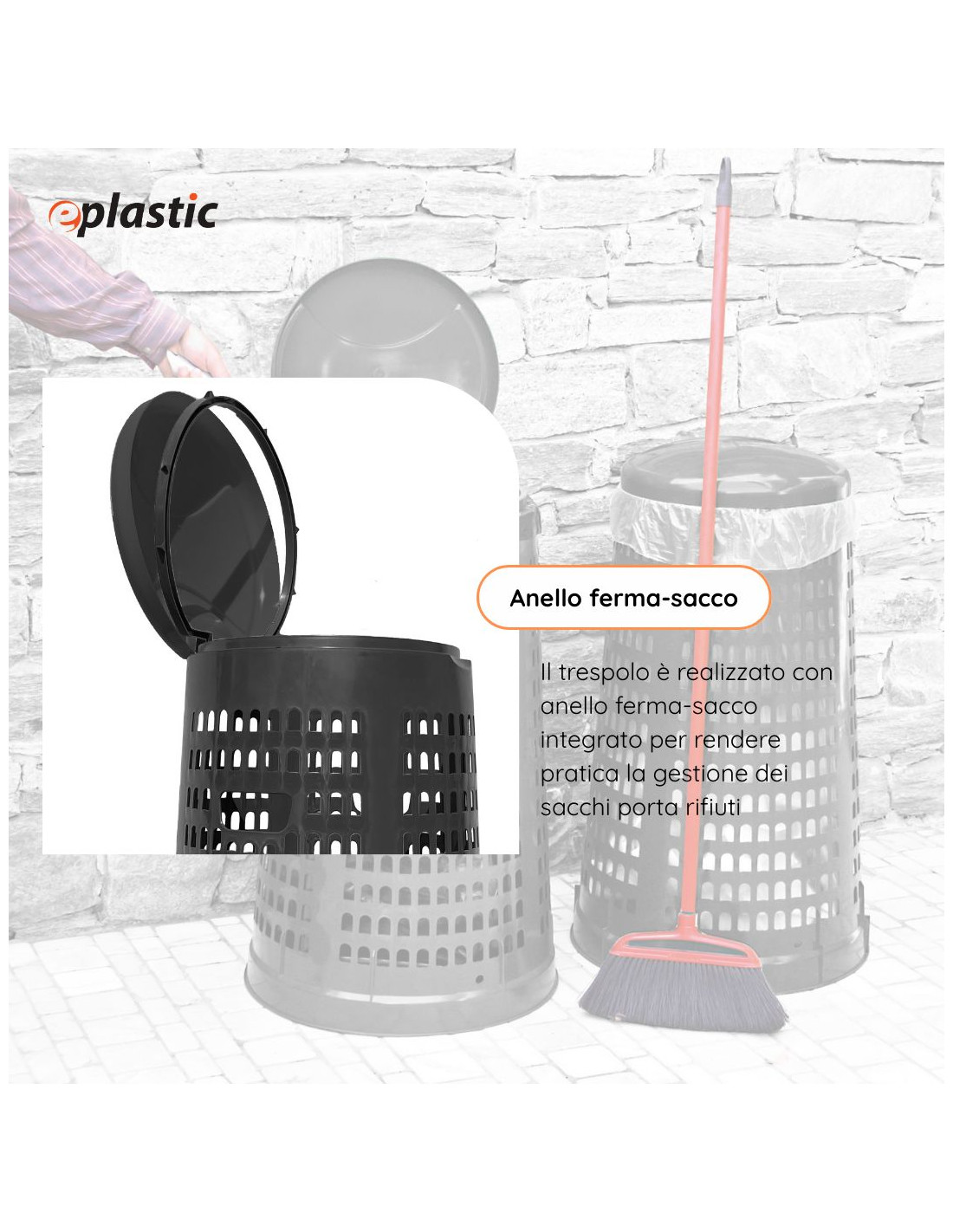 Trespolo leggero e facilmente sollevabile, pratico e semplice da utilizzare in PEHD (Polietilene ad alta densità) monocolore grigio o verde. Il prodotto è estremamente versatile e adatto a qualsiasi tipo di rifiuto perché prevede l'utilizzo di sacchi per immondizia che possono essere facilmente fissati mediante l'apposito anello ferma sacco. Il fatto che non abbia contatto diretto con i rifiuti lo rende ancor più facilmente lavabile e sterilizzabile.