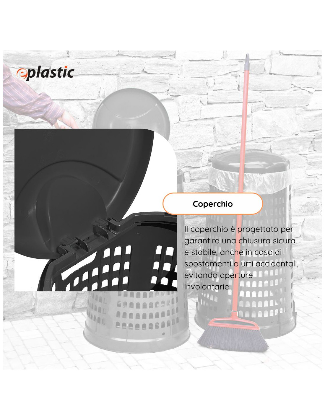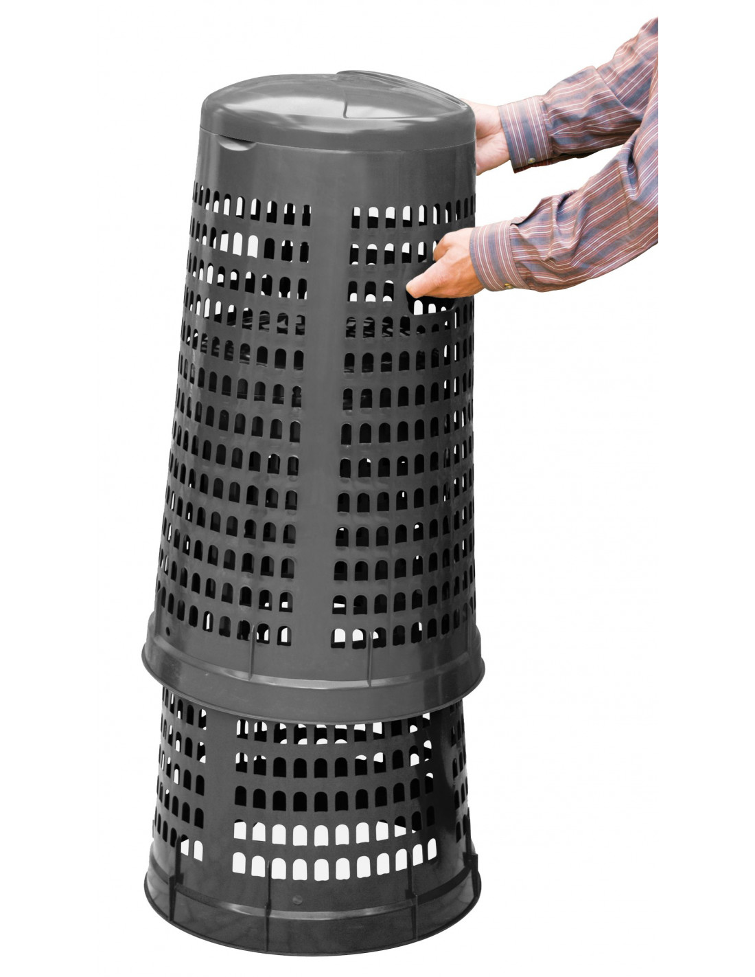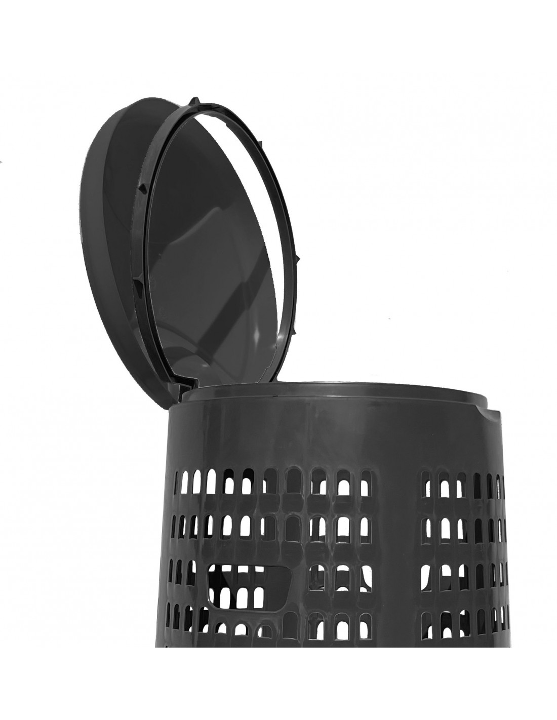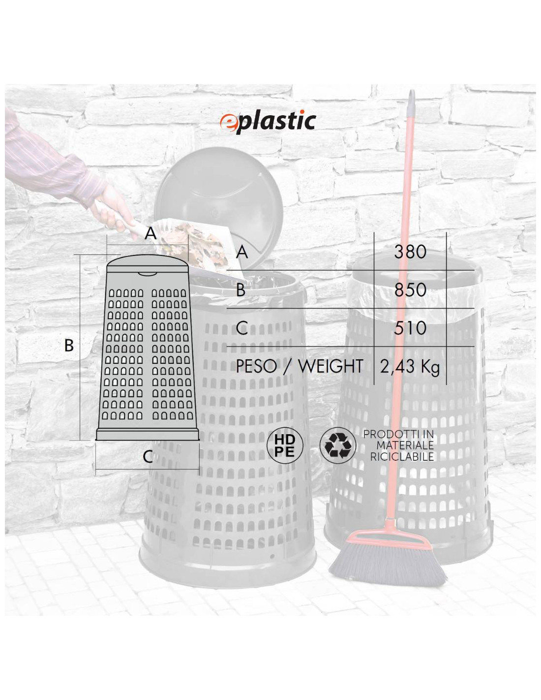 Trespolo leggero e facilmente sollevabile, pratico e semplice da utilizzare in PEHD (Polietilene ad alta densità) monocolore grigio o verde. Il prodotto è estremamente versatile e adatto a qualsiasi tipo di rifiuto perché prevede l'utilizzo di sacchi per immondizia che possono essere facilmente fissati mediante l'apposito anello ferma sacco. Il fatto che non abbia contatto diretto con i rifiuti lo rende ancor più facilmente lavabile e sterilizzabile.